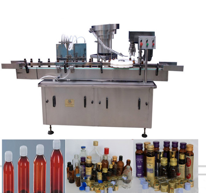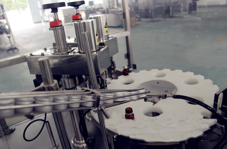 該西林瓶灌裝壓塞鎖蓋機(jī)集自動(dòng)進(jìn)瓶、理蓋、上蓋、抽吸真空、旋蓋、出瓶于一體,生產(chǎn)效率高,運(yùn)行穩(wěn)定可靠;西林瓶灌裝壓塞鎖蓋機(jī)的真空度可按需要設(shè)定,使用旋合式旋蓋原理和全密封真空式結(jié)構(gòu);該西林瓶灌裝壓塞鎖蓋機(jī)自動(dòng)化程度高,設(shè)計(jì)合理,主要是由瓶子輸送、理蓋、夾瓶掛蓋、旋蓋、電控等機(jī)構(gòu)和抽真空系統(tǒng)組成;此西林瓶灌裝壓塞鎖蓋機(jī)能耗低、適應(yīng)性好,旋蓋機(jī)構(gòu)高度可調(diào)節(jié),適應(yīng)相同口徑、不同高度的瓶子旋蓋;更換部分零件即可實(shí)現(xiàn)不同瓶徑、不同口徑的旋蓋,更換快捷方便;夾瓶子的托爪帶有膠墊,真空罩、旋蓋、配蓋機(jī)構(gòu)都是氣缸驅(qū)動(dòng),在使用過(guò)程中都能做出精確調(diào)整,動(dòng)作靈活;送蓋機(jī)構(gòu)有光電感應(yīng)安全保護(hù)裝置,可實(shí)現(xiàn)無(wú)蓋開機(jī)送蓋,蓋滿關(guān)機(jī)不送蓋;