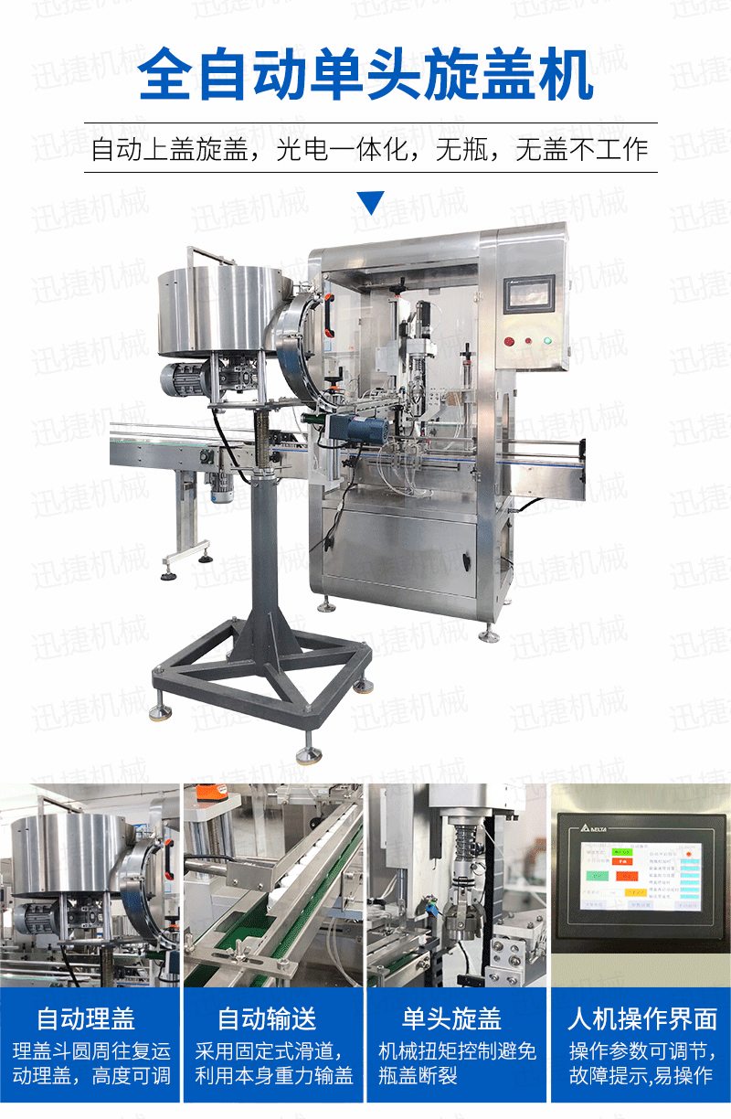 3.摩擦式旋蓋,旋轉(zhuǎn)式輸蓋,無(wú)震動(dòng)、無(wú)噪音。