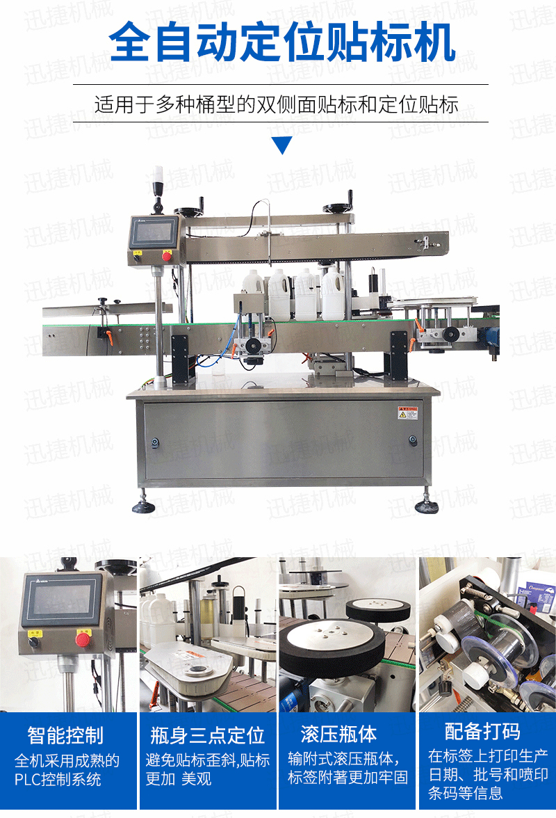 全自動(dòng)貼標(biāo)機(jī)采用微電腦-PLC-電子光纖傳感器控制系統(tǒng),使整機(jī)運(yùn)行穩(wěn)定、高速、操作系統(tǒng)采用操作界面控制,操作簡(jiǎn)便、實(shí)用、效率高,并有產(chǎn)量記數(shù)功能 速度快且穩(wěn)定,適用范圍大,可用于各種尺寸的圓形瓶貼標(biāo)輸附式滾壓瓶體,使標(biāo)簽附著更加牢固 前后段可選連線使用。