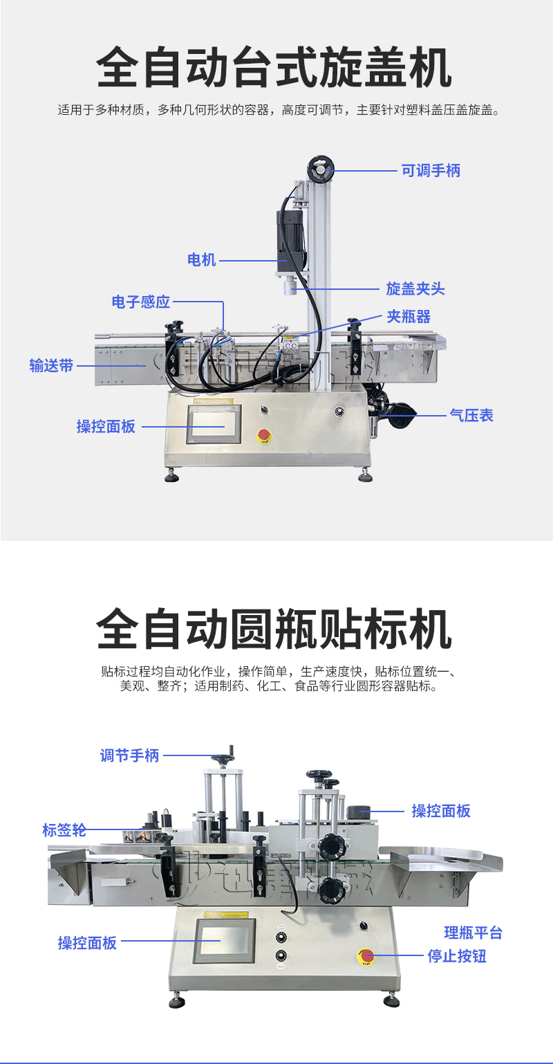 本設備主要適用于食品、日?;ぁ⑥r藥、醫(yī)藥和特殊行業(yè)。灌裝精度將受氣壓的穩(wěn)定性、物料的均勻性、灌裝速度等的影響。 產品說明:生產線根據灌裝范圍選擇型號,灌裝部分為雙頭下潛式灌裝機,適用于不同物料不同瓶子的灌裝,配備自動壓蓋機和圓瓶貼標機,可實現不同蓋子的旋蓋貼標工作。