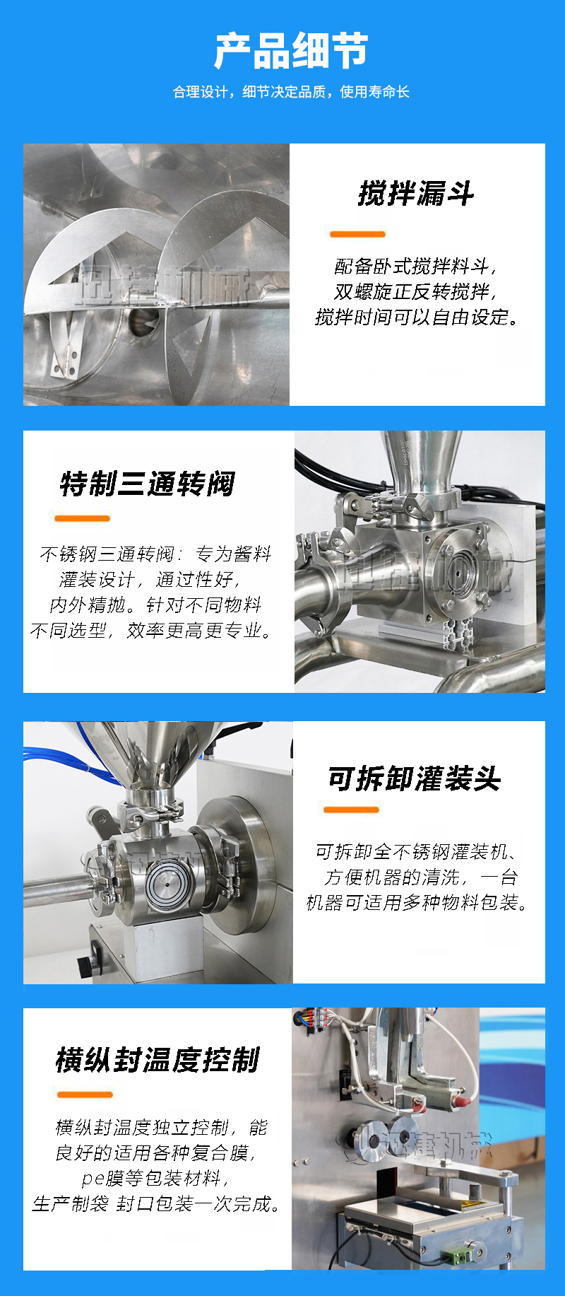 主要用途: DXD-60J醬料包裝機(jī)適用于包裝芝麻醬、食用油、洗發(fā)液、調(diào)味汁、油脂、脂膏、化妝品等產(chǎn)品,將其灌入袋內(nèi),能適合各種粘度的產(chǎn)品。該機(jī)具有快速、精確、經(jīng)濟(jì)和實(shí)用的優(yōu)點(diǎn)。雙系統(tǒng)設(shè)置,可實(shí)現(xiàn)醬與油的分流包裝。