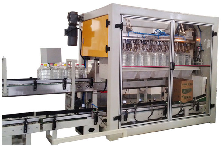 4、2.5升食用油開(kāi)裝封箱包裝流水線設(shè)有多種保護(hù)功能,出現(xiàn)故障時(shí)及時(shí)停機(jī)。如:進(jìn)箱帶上不滿(mǎn)箱時(shí)自動(dòng)停 機(jī)等待;整列機(jī)處無(wú)產(chǎn)品自動(dòng)停機(jī)等待;